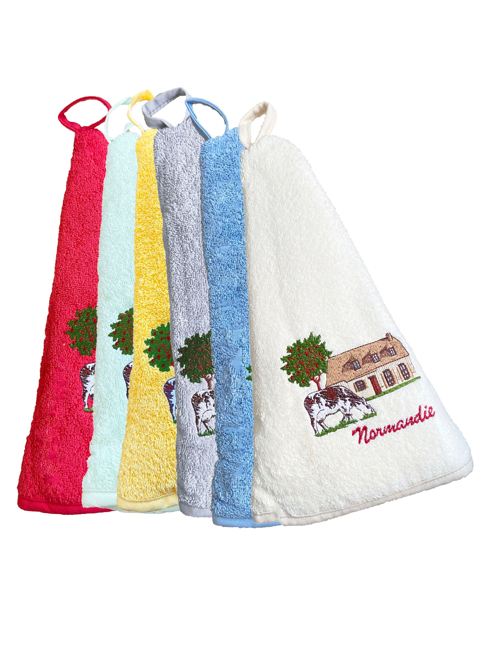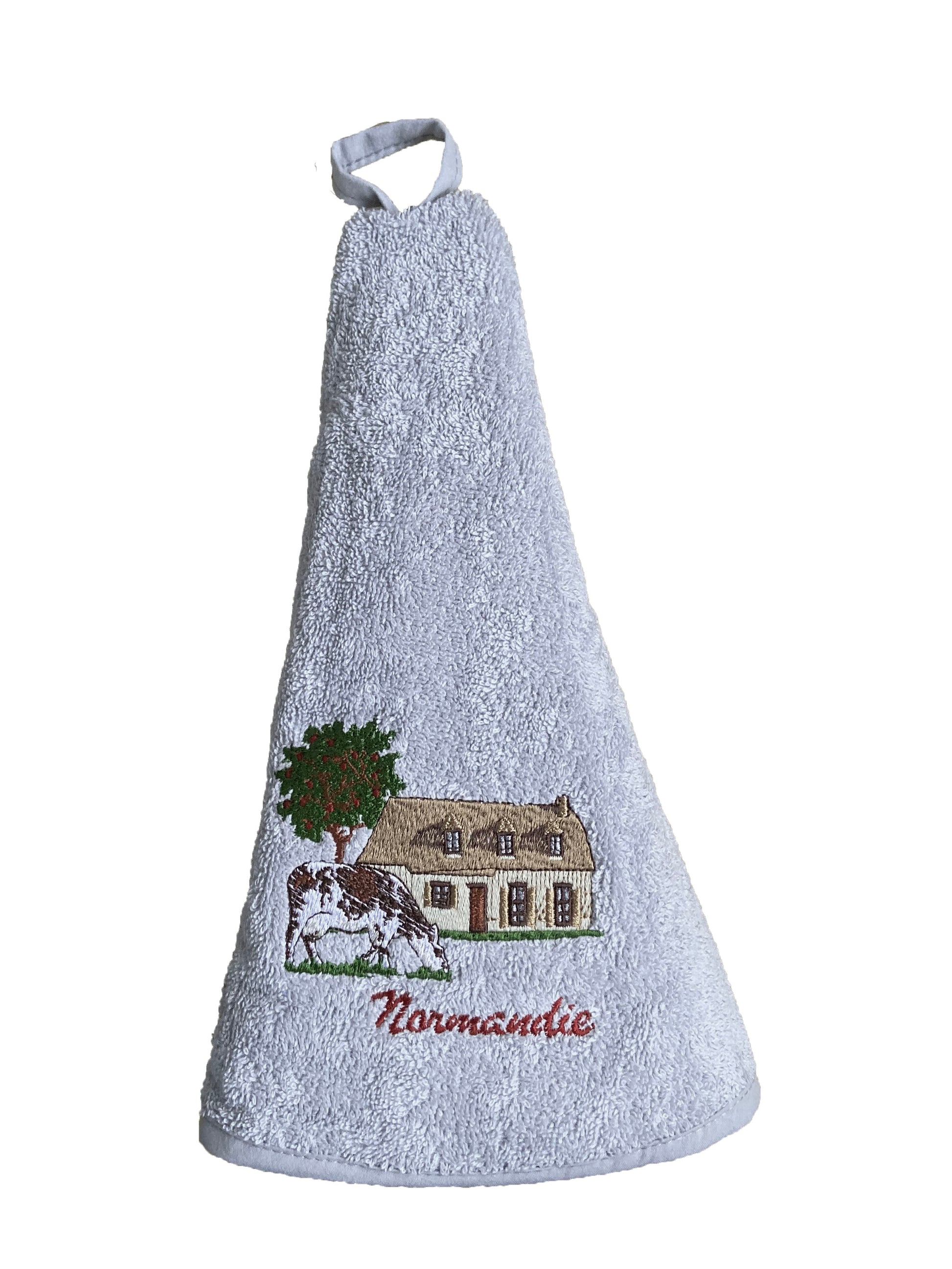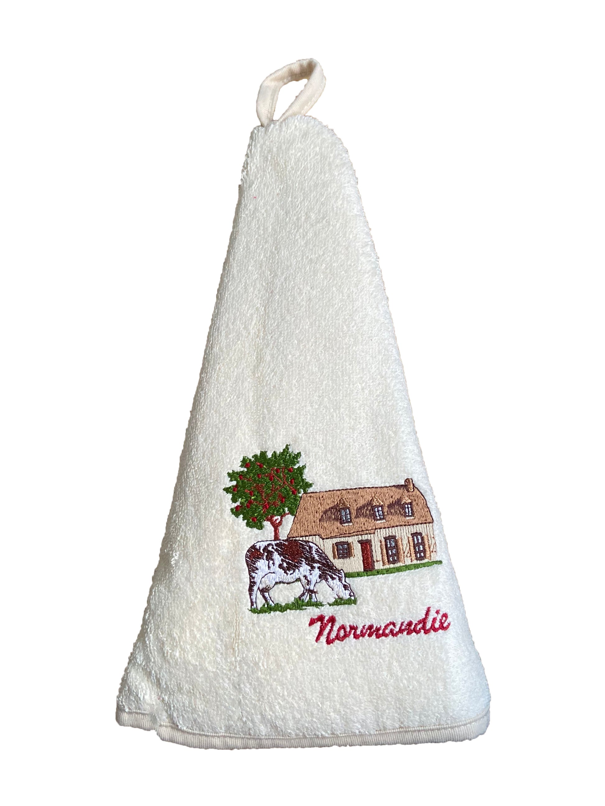 Apporte une bouffée d’air de la campagne normande avec ce superbe torchon rond, brodé d’une vache et d’une maison typique !